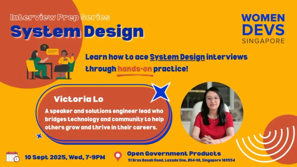 System design interviews don’t have to feel overwhelming. In this workshop, speaker, solutions engineer lead, and WomenDevsSG director Victoria Lo will walk you through a practical framework that helps you structure your answers, communicate tradeoffs, and focus on what interviewers actually want to see.